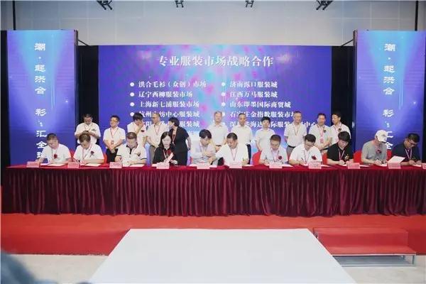 洪合毛衫(眾創)市場與北京大紅門國際商貿城、杭展場設計州中紡中心展場設計服裝城、濟南濼口服裝城、江西萬馬服裝城、遼寧西沈浸式體驗柳服裝市場、山東即墨國際商貿城、上海新人形立牌七浦服裝市場、深圳華海達國際服裝交易中心、沈陽五愛市場服裝城、石家莊包裝設計金指數服裝市場等10家國內場地佈置專業市場達成了戰略合作簽約。